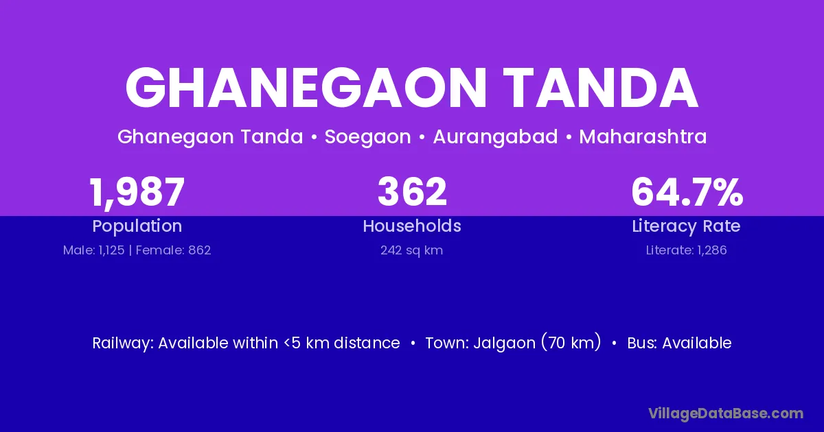 Jalgaon (70 km) is the nearest town to Ghanegaon Tanda village for major economic activities and is located approximately 70 km away.