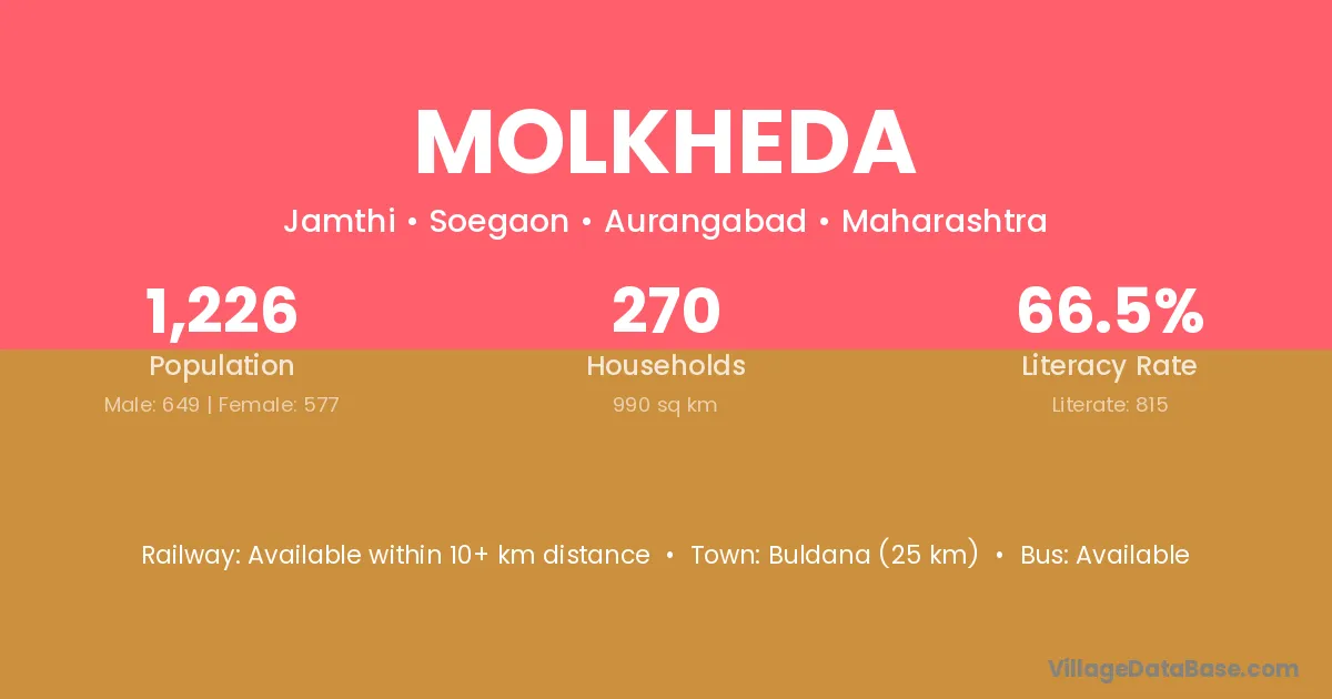 Molkheda village has a total population of 1,226 people, of which 649 are males and 577 are females.