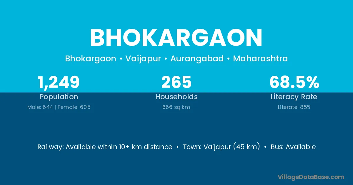 Vaijapur (45 km) is the nearest town to Bhokargaon village for major economic activities and is located approximately 45 km away.