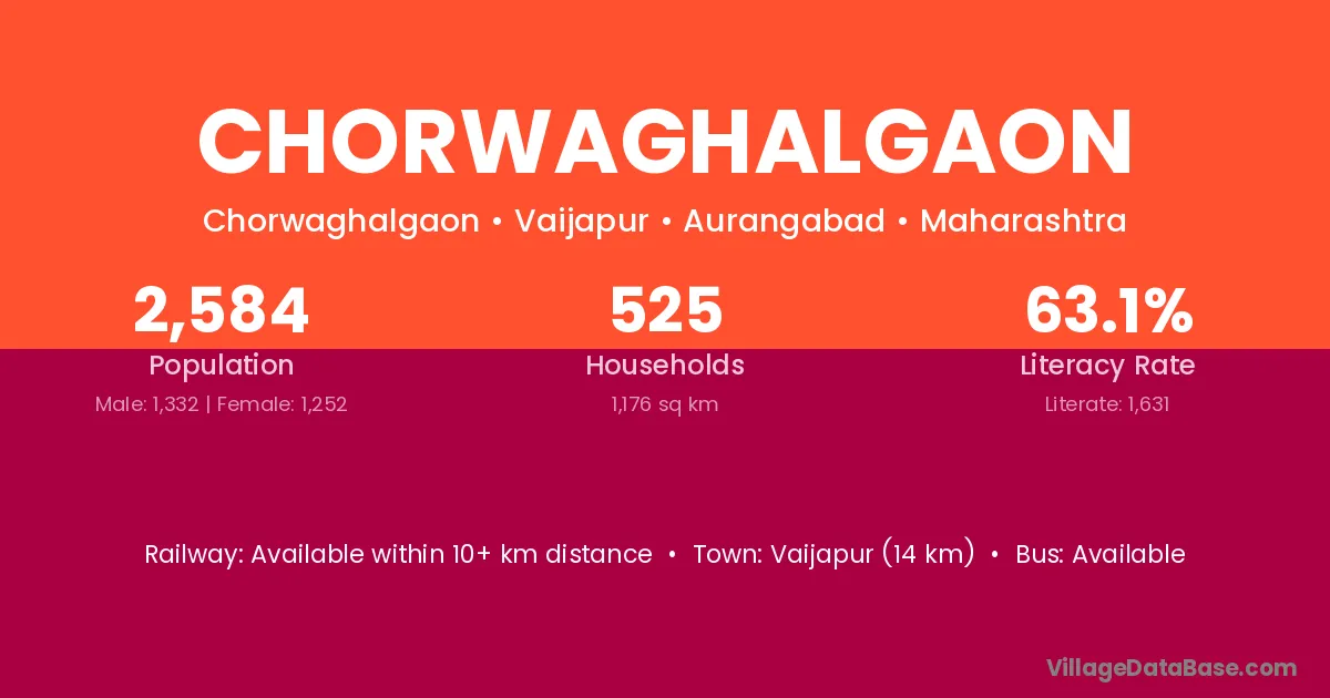 Vaijapur (14 km) is the nearest town to Chorwaghalgaon village for major economic activities and is located approximately 14 km away.