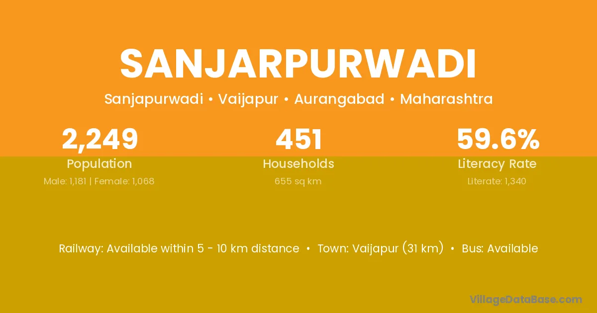 Vaijapur (31 km) is the nearest town to Sanjarpurwadi village for major economic activities and is located approximately 31 km away.