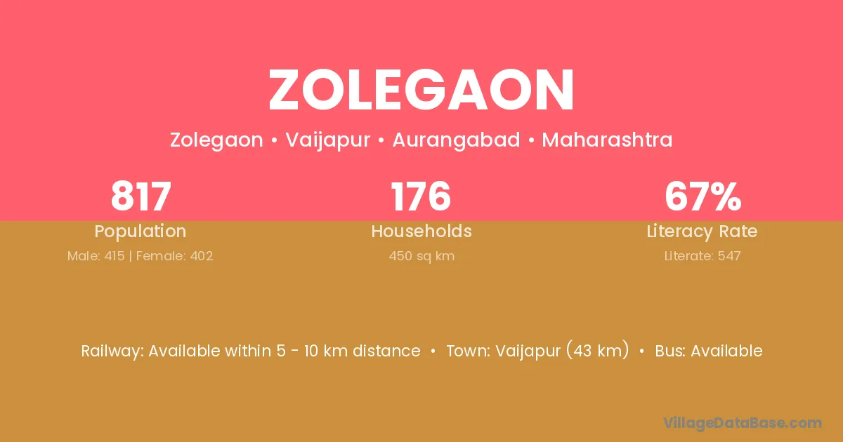 Vaijapur (43 km) is the nearest town to Zolegaon village for major economic activities and is located approximately 43 km away.