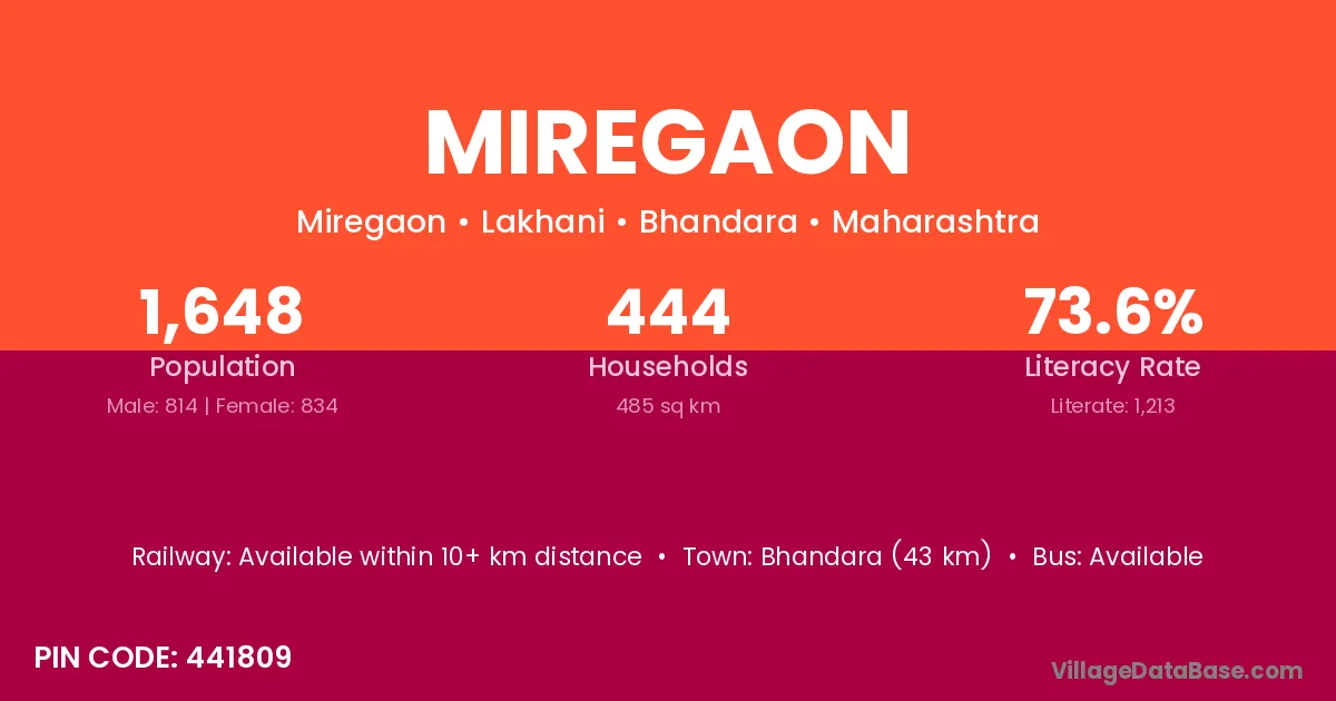 Bhandara (43 km) is the nearest town to Miregaon village for major economic activities and is located approximately 43 km away.