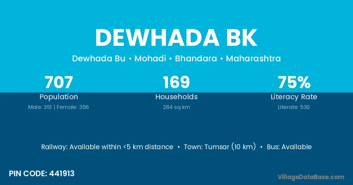 Tumsar (10 km) is the nearest town to Dewhada Bk village for major economic activities and is located approximately 10 km away.