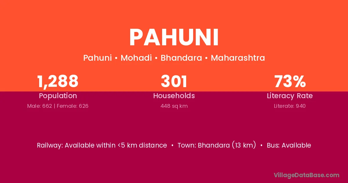 Bhandara (13 km) is the nearest town to Pahuni village for major economic activities and is located approximately 13 km away.