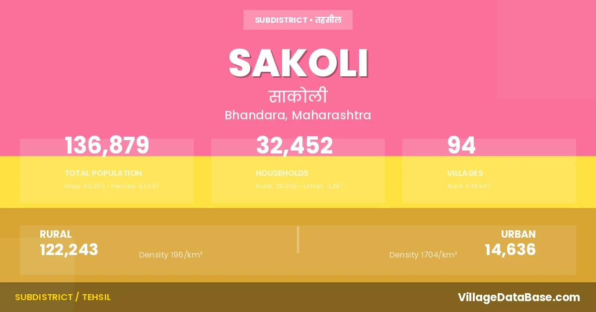 According to the 2011 census The total area of Sakoli Tehsil is 634 km², with a population of 136879 people. The population density is 216 inhabitants per square kilometre, and there are approximately 32452 houses in the sub district.