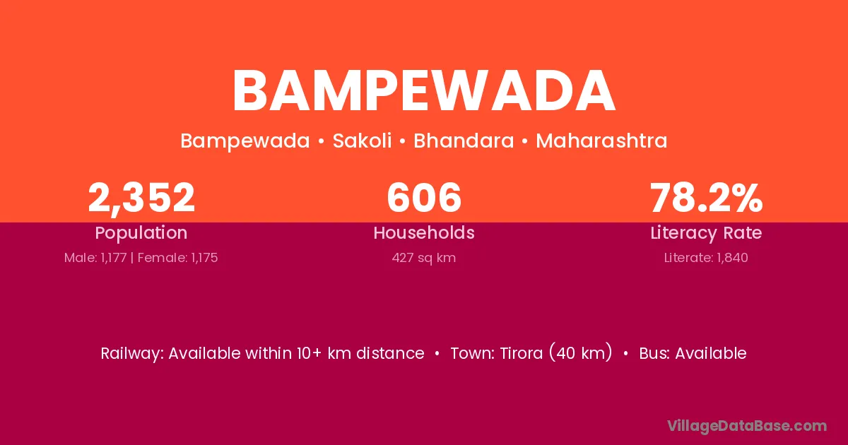 Tirora (40 km) is the nearest town to Bampewada village for major economic activities and is located approximately 40 km away.