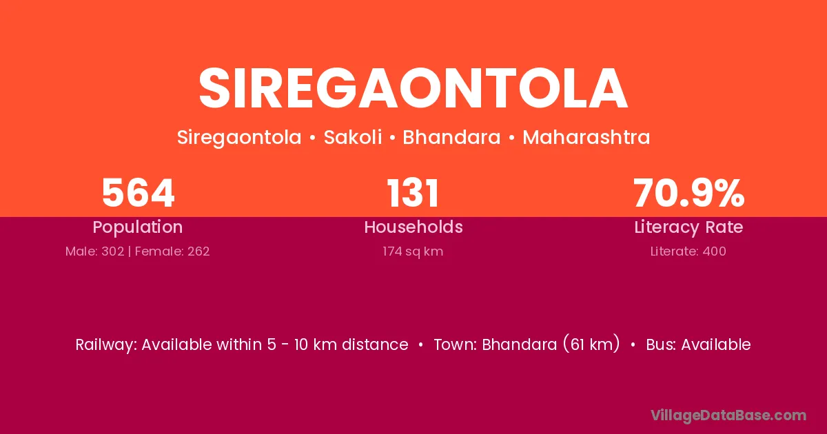 Bhandara (61 km) is the nearest town to Siregaontola village for major economic activities and is located approximately 61 km away.