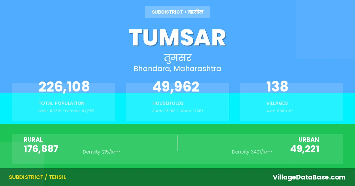 According to the 2011 census The total area of Tumsar Tehsil is 838 km², with a population of 226108 people. The population density is 270 inhabitants per square kilometre, and there are approximately 49962 houses in the sub district.