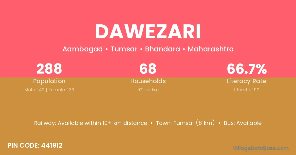 Tumsar (8 km) is the nearest town to Dawezari village for major economic activities and is located approximately 8 km away.
