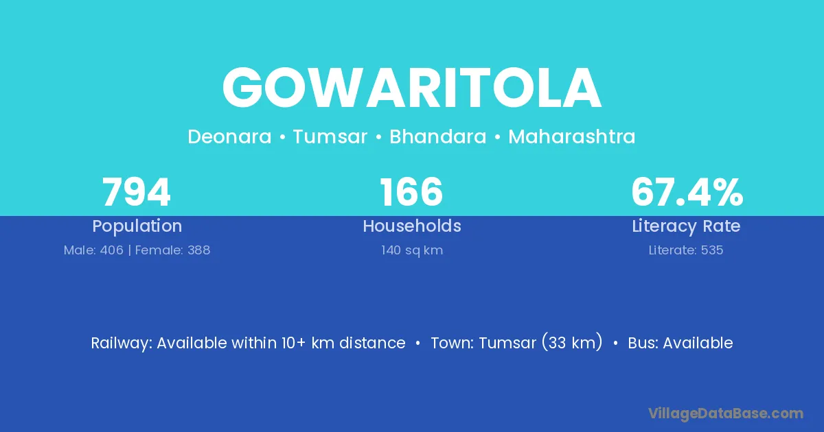Tumsar (33 km) is the nearest town to Gowaritola village for major economic activities and is located approximately 33 km away.