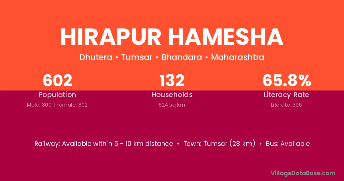 Tumsar (28 km) is the nearest town to Hirapur Hamesha village for major economic activities and is located approximately 28 km away.