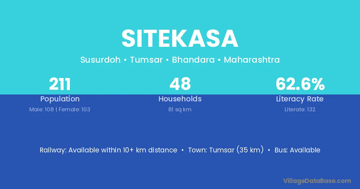 Tumsar (35 km) is the nearest town to Sitekasa village for major economic activities and is located approximately 35 km away.