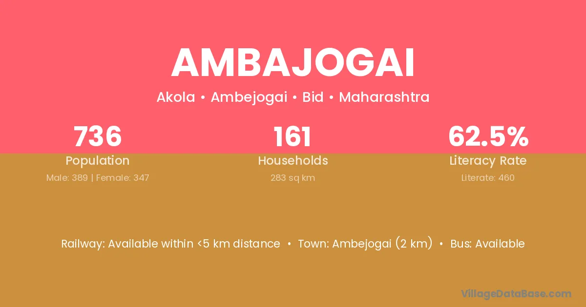 Ambejogai (2 km) is the nearest town to Ambajogai village for major economic activities and is located approximately 2 km away.