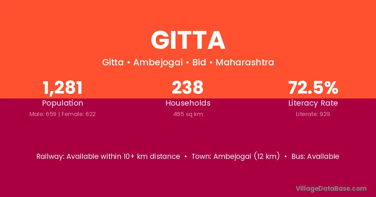 Ambejogai (12 km) is the nearest town to Gitta village for major economic activities and is located approximately 12 km away.