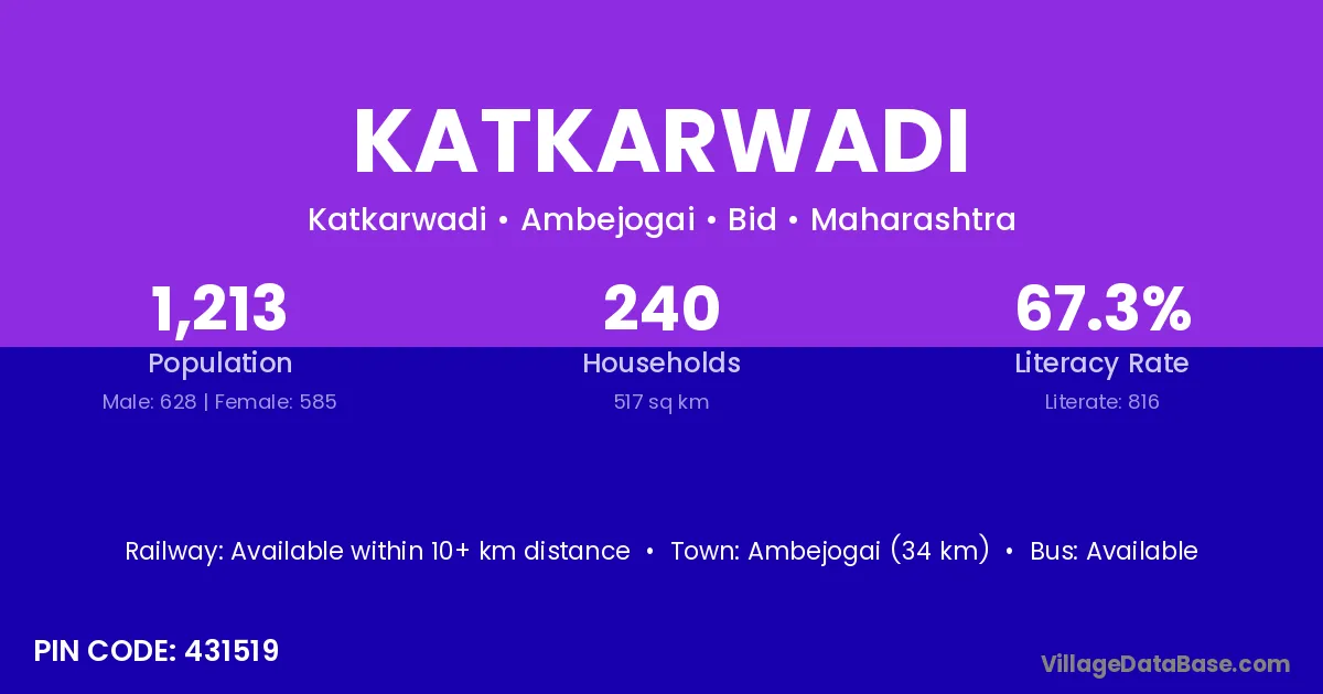 Ambejogai (34 km) is the nearest town to Katkarwadi village for major economic activities and is located approximately 34 km away.
