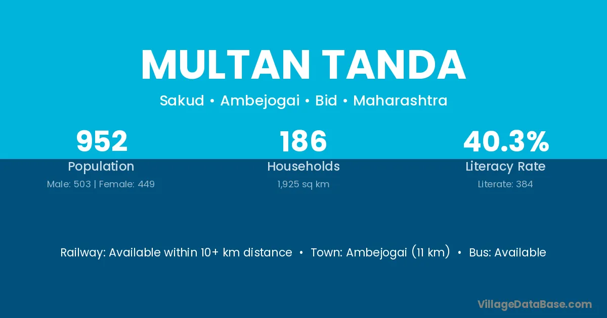 Ambejogai (11 km) is the nearest town to Multan Tanda village for major economic activities and is located approximately 11 km away.