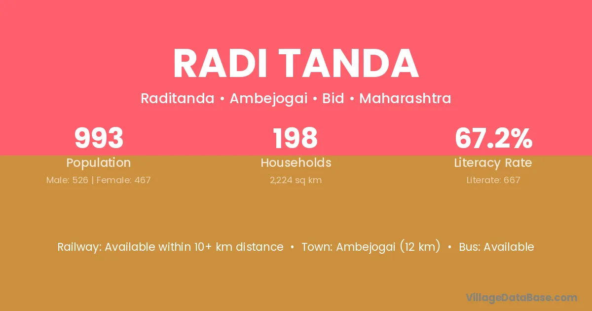 Ambejogai (12 km) is the nearest town to Radi Tanda village for major economic activities and is located approximately 12 km away.