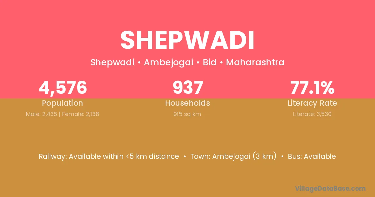 Ambejogai (3 km) is the nearest town to Shepwadi village for major economic activities and is located approximately 3 km away.