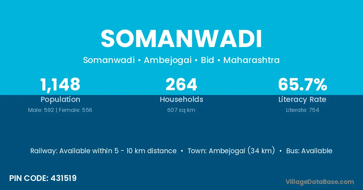 Ambejogai (34 km) is the nearest town to Somanwadi village for major economic activities and is located approximately 34 km away.