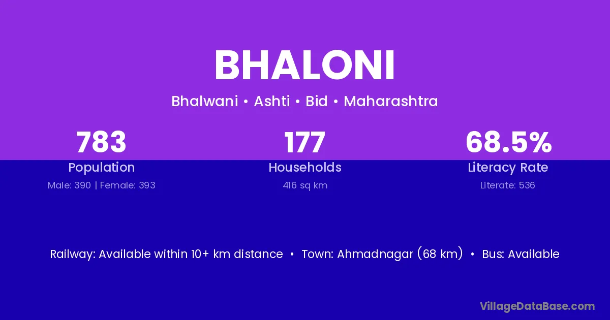 Ahmadnagar (68 km) is the nearest town to Bhaloni village for major economic activities and is located approximately 68 km away.