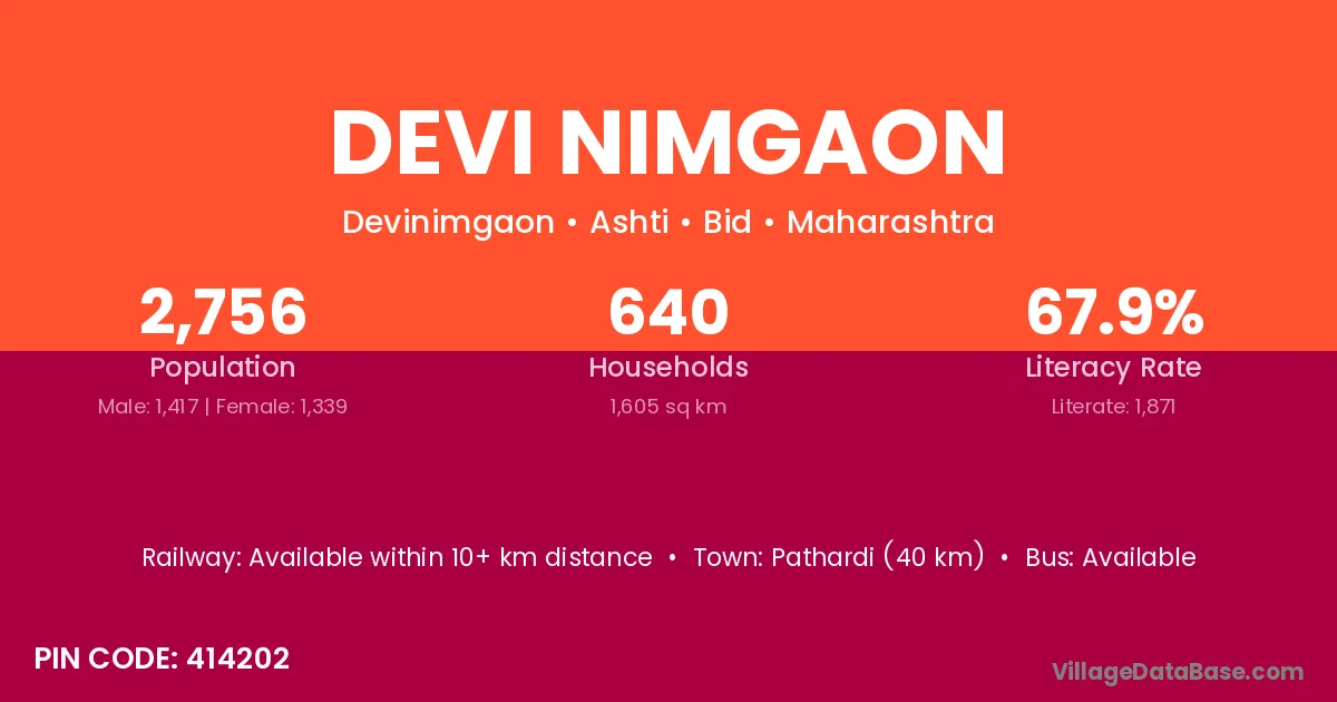 Pathardi (40 km) is the nearest town to Devi Nimgaon village for major economic activities and is located approximately 40 km away.