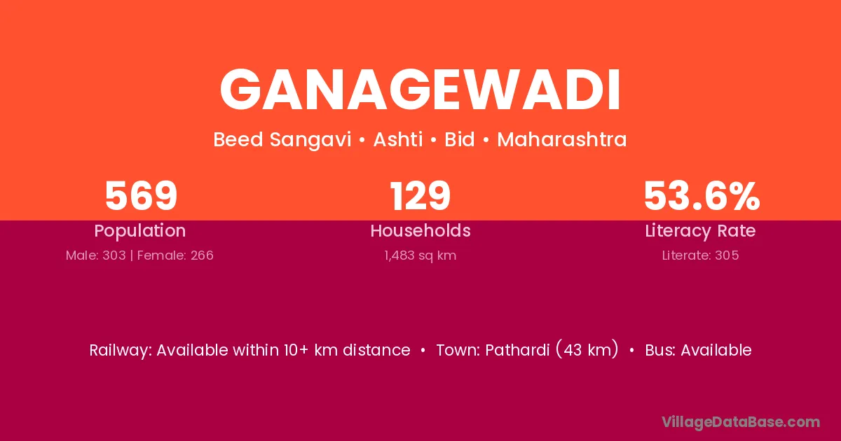 Pathardi (43 km) is the nearest town to Ganagewadi village for major economic activities and is located approximately 43 km away.