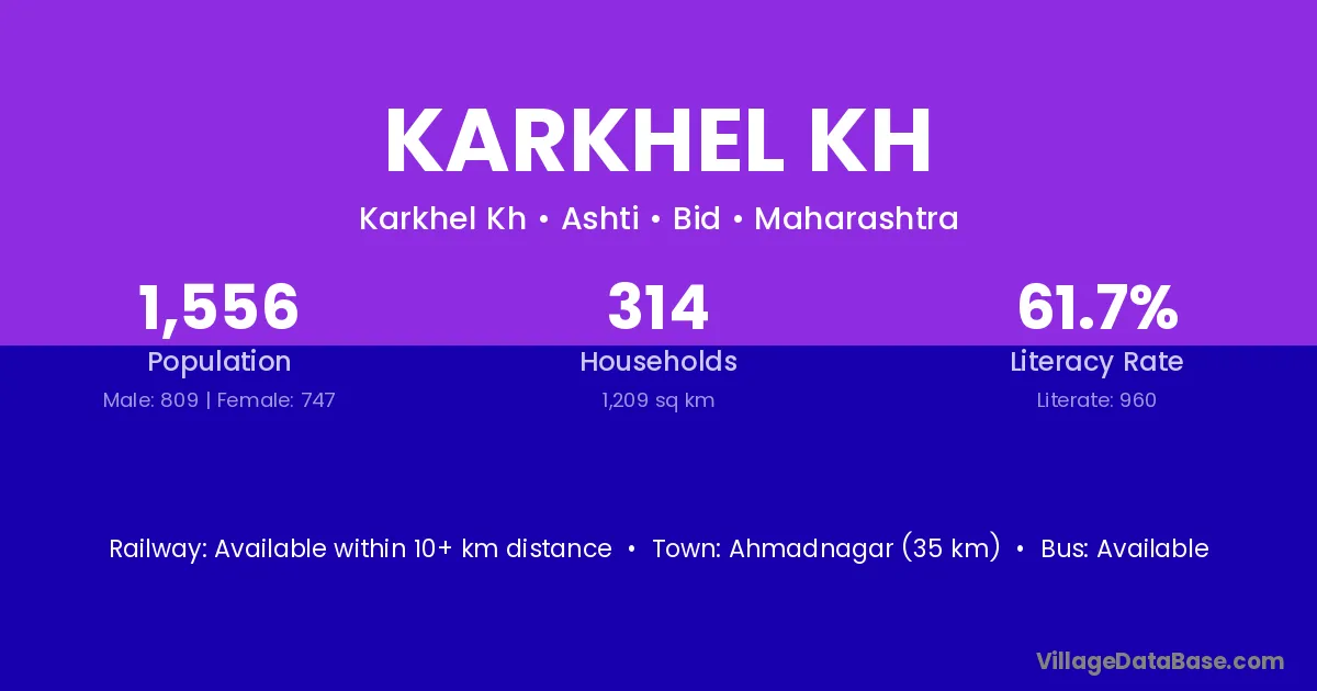 Ahmadnagar (35 km) is the nearest town to Karkhel Kh village for major economic activities and is located approximately 35 km away.