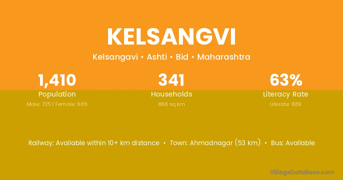 Ahmadnagar (53 km) is the nearest town to Kelsangvi village for major economic activities and is located approximately 53 km away.