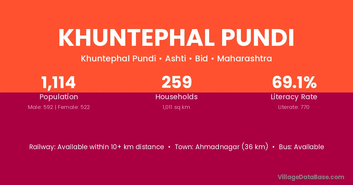Ahmadnagar (36 km) is the nearest town to Khuntephal Pundi village for major economic activities and is located approximately 36 km away.