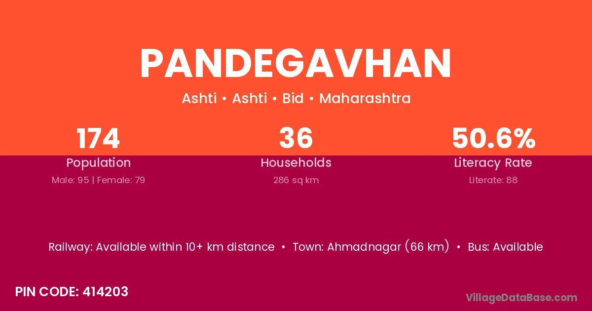 Ahmadnagar (66 km) is the nearest town to Pandegavhan village for major economic activities and is located approximately 66 km away.
