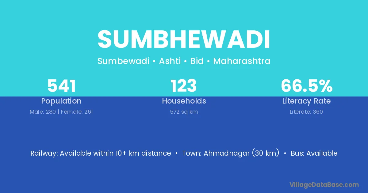 Ahmadnagar (30 km) is the nearest town to Sumbhewadi village for major economic activities and is located approximately 30 km away.