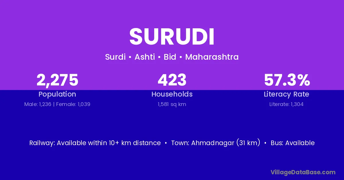 Ahmadnagar (31 km) is the nearest town to Surudi village for major economic activities and is located approximately 31 km away.