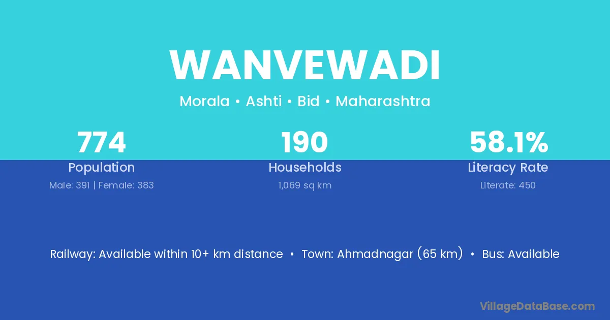 Wanvewadi village has a total population of 774 people, of which 391 are males and 383 are females.