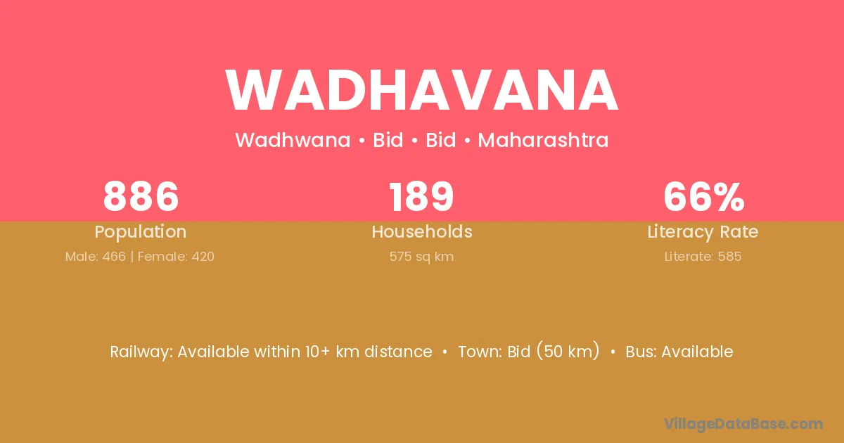 Bid (50 km) is the nearest town to Wadhavana village for major economic activities and is located approximately 50 km away.