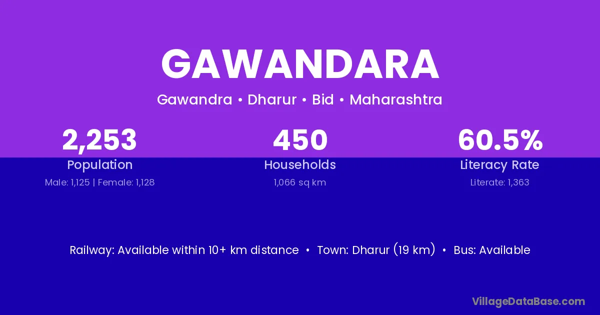 Dharur (19 km) is the nearest town to Gawandara village for major economic activities and is located approximately 19 km away.
