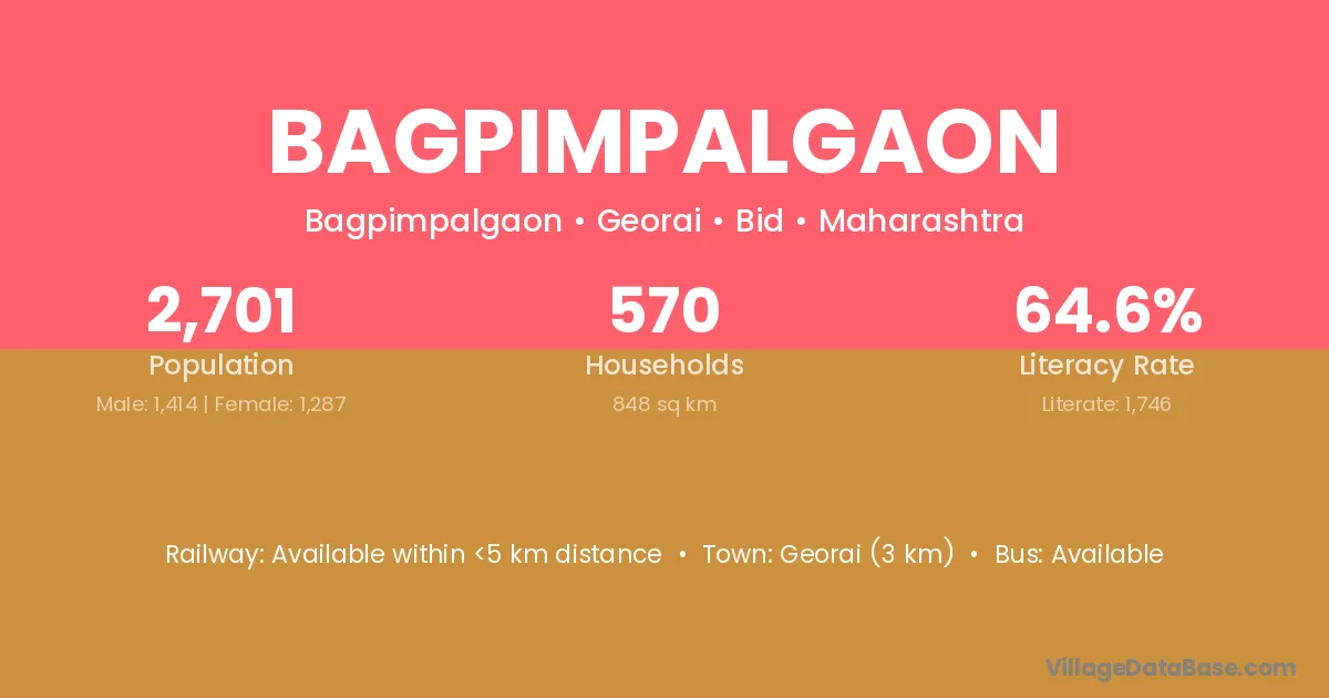 Georai (3 km) is the nearest town to Bagpimpalgaon village for major economic activities and is located approximately 3 km away.