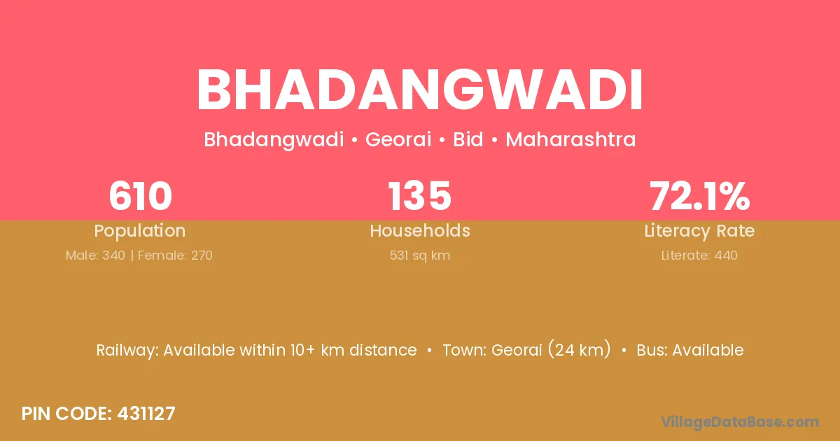 Georai (24 km) is the nearest town to Bhadangwadi village for major economic activities and is located approximately 24 km away.