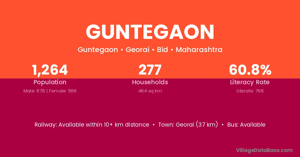 Georai (37 km) is the nearest town to Guntegaon village for major economic activities and is located approximately 37 km away.