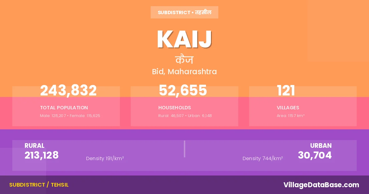 According to the 2011 census The total area of Kaij Tehsil is 1157 km², with a population of 243832 people. The population density is 211 inhabitants per square kilometre, and there are approximately 52655 houses in the sub district.