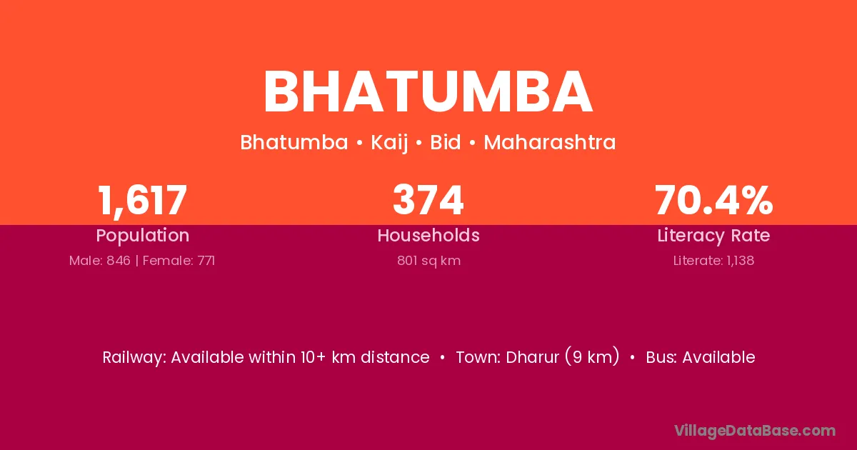 Dharur (9 km) is the nearest town to Bhatumba village for major economic activities and is located approximately 9 km away.