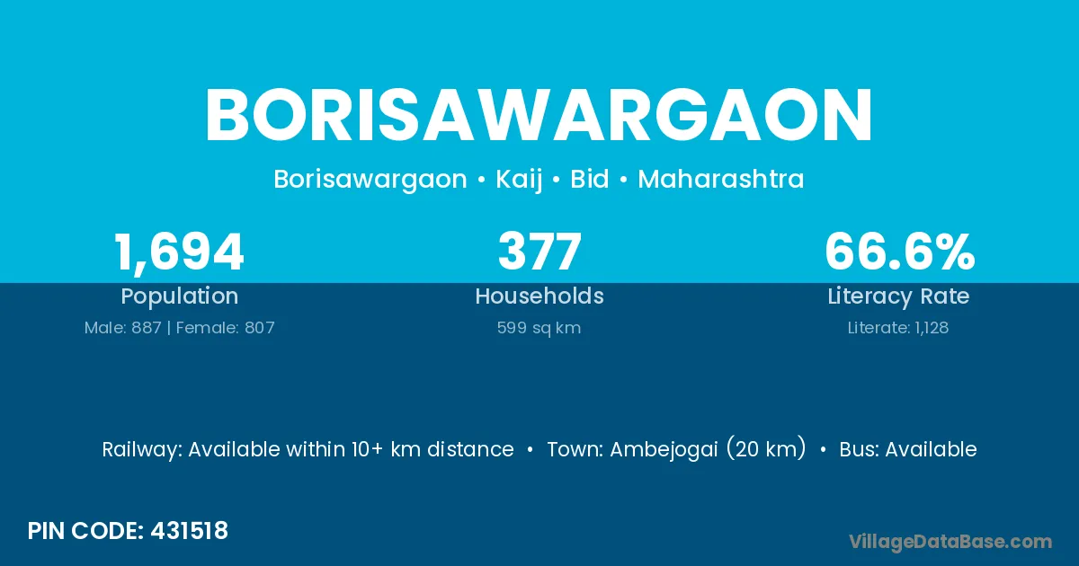 Ambejogai (20 km) is the nearest town to Borisawargaon village for major economic activities and is located approximately 20 km away.