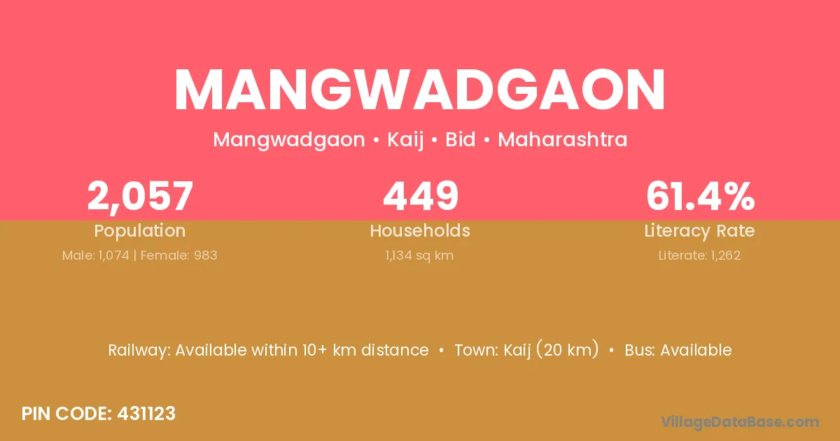 Kaij (20 km) is the nearest town to Mangwadgaon village for major economic activities and is located approximately 20 km away.