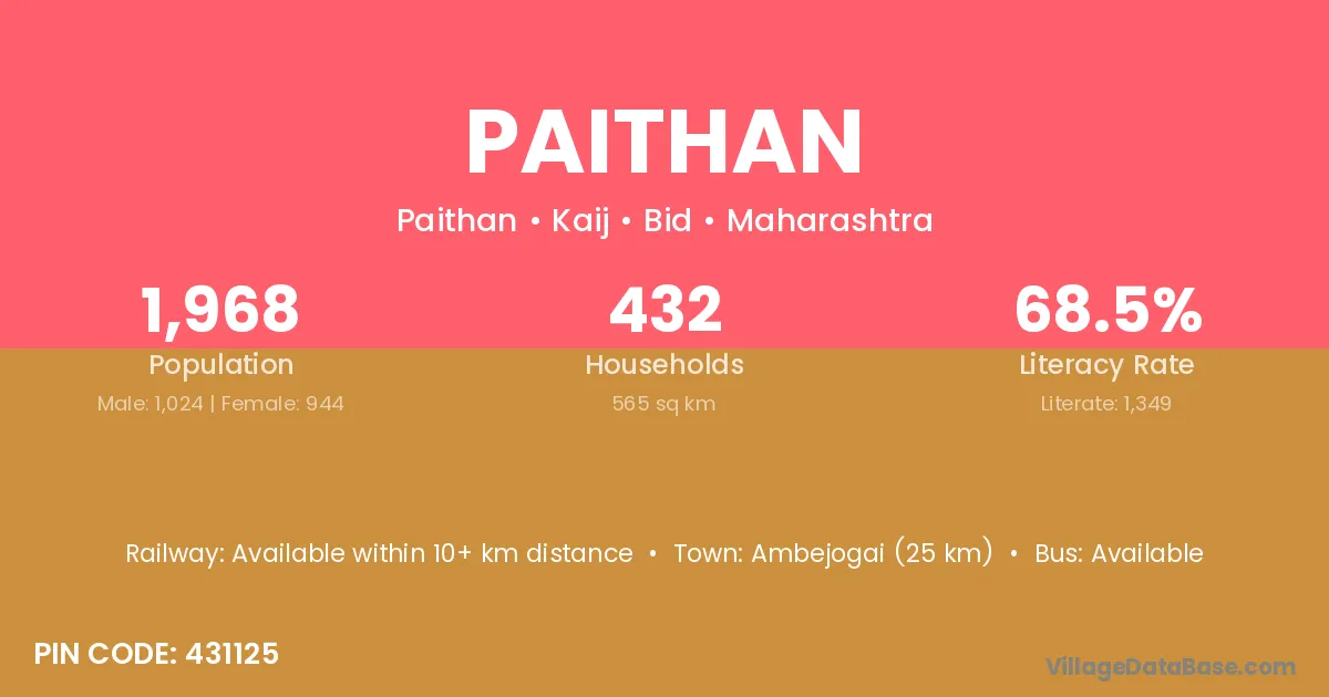 Ambejogai (25 km) is the nearest town to Paithan village for major economic activities and is located approximately 25 km away.