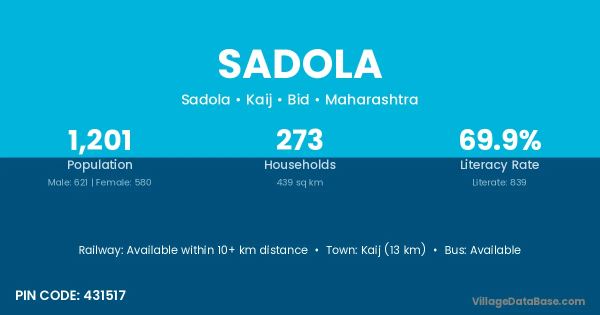 Kaij (13 km) is the nearest town to Sadola village for major economic activities and is located approximately 13 km away.