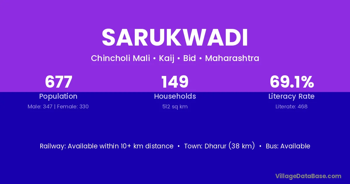Dharur (38 km) is the nearest town to Sarukwadi village for major economic activities and is located approximately 38 km away.