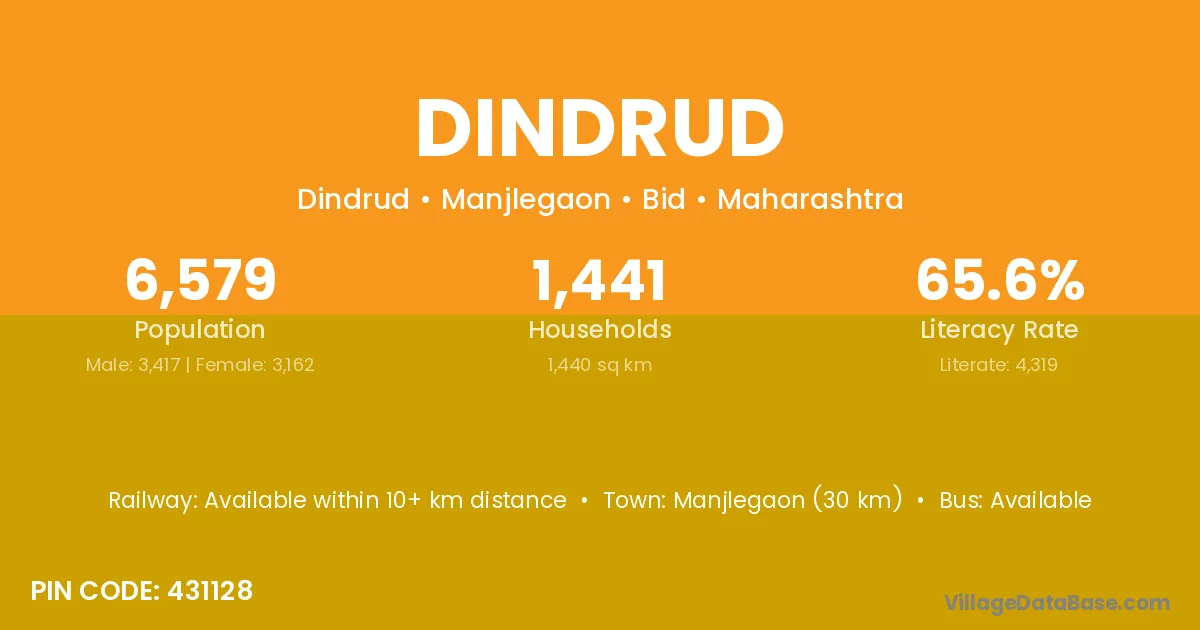 Manjlegaon (30 km) is the nearest town to Dindrud village for major economic activities and is located approximately 30 km away.