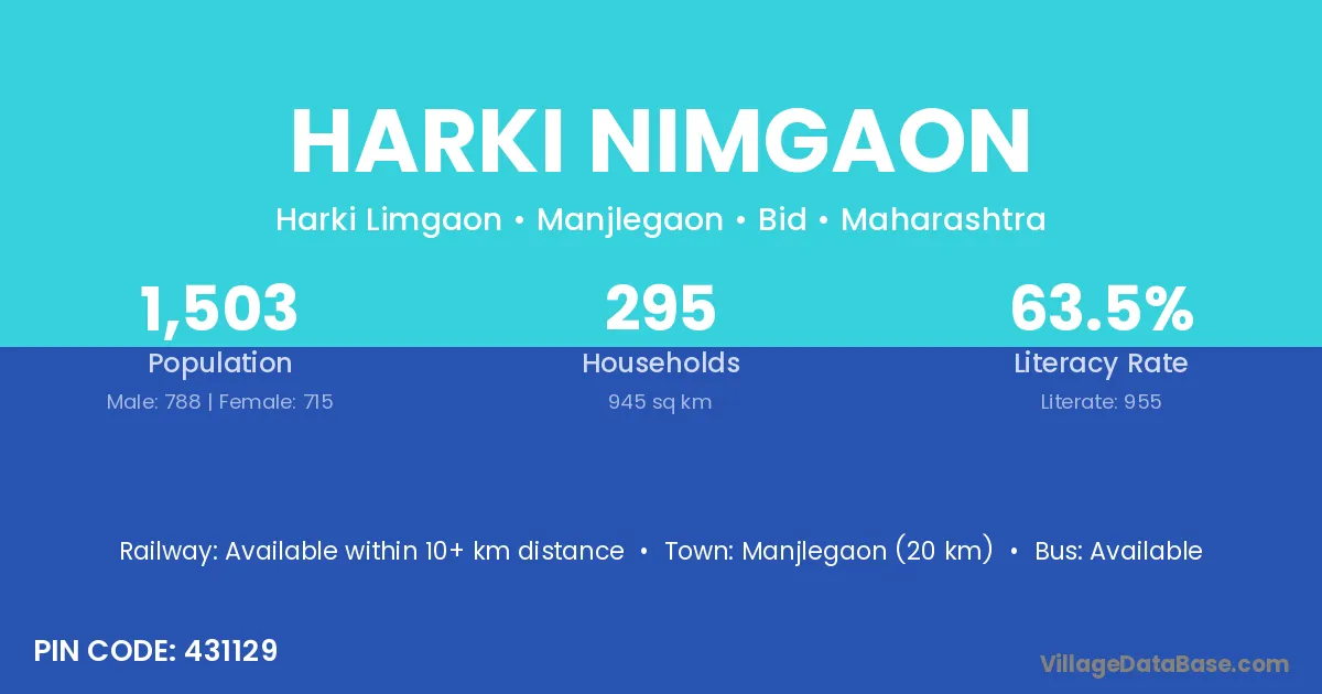 Manjlegaon (20 km) is the nearest town to Harki Nimgaon village for major economic activities and is located approximately 20 km away.