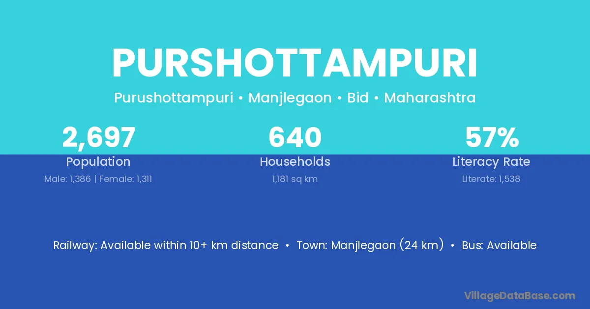 Manjlegaon (24 km) is the nearest town to Purshottampuri village for major economic activities and is located approximately 24 km away.
