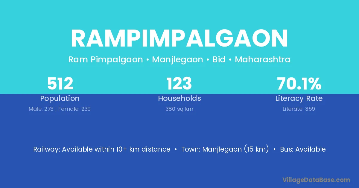 Manjlegaon (15 km) is the nearest town to Rampimpalgaon village for major economic activities and is located approximately 15 km away.